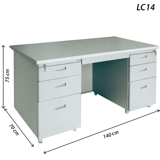 Bàn làm việc chân sắt Hòa Phát LC14 gồm 2 hộc liền 3 ngăn kéo, bàn phím bằng sắt. Mặt bàn phủ gỗ Laminate dày 25mm, chân tăng chỉnh, sơn màu ghi.