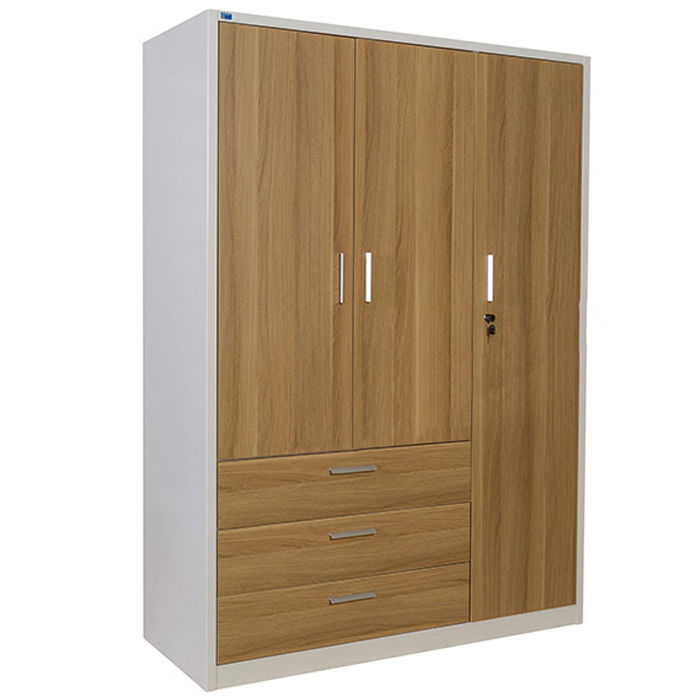 Tủ sắt quần áo Hòa Phát TU18B2C3 sơn tĩnh điện, cánh gỗ cong nghiệp phủ Melamine phục vụ cho đối tượng cá nhân, gia đình. Tủ gồm 3 cánh mở và 3 ngăn kéo. Khoang cánh ngắn gồm 1 đợt di động và 1 suốt treo áo. Khoang cánh dài gồm 1 đợt di động, 1 suốt treo quần áo và 1 ngăn phụ có khóa.
