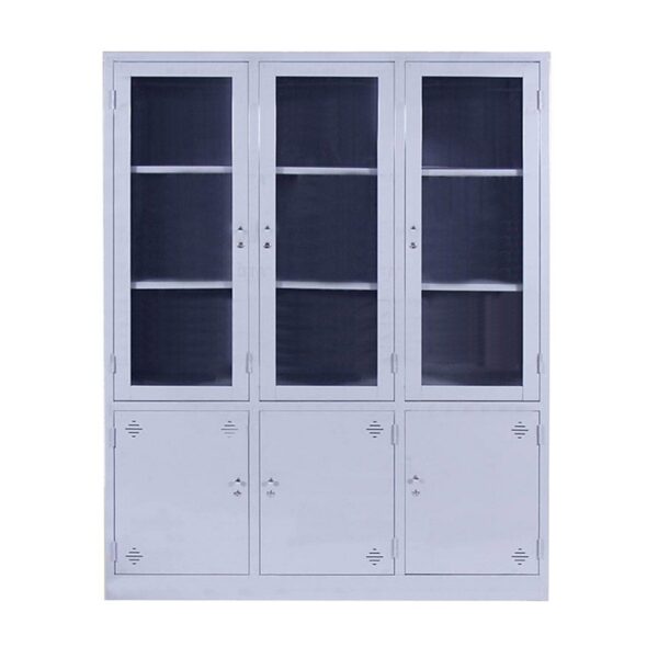 Tủ sắt giá rẻ K7 sơn tĩnh điện màu ghi gồm 6 cánh, trên 3 cánh kính, dưới 3 cánh tôn kín.