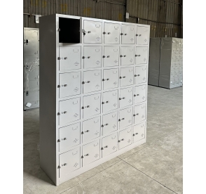 Tủ sắt locker giá rẻ LK30 sơn tĩnh điện màu ghi, tủ gồm 30 ô, mỗi ô có 1 cánh mở, 1 khóa locker, 1 núm tay nắm và tai móc khóa.