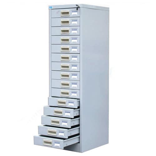 Tủ sắt Hòa Phát sơn tĩnh điện màu ghi, có 1 khối gồm có 15 ngăn kéo đựng tài liệu, sử dụng  khóa dàn, mỗi khoang kéo có 1 tay nắm nhựa.
