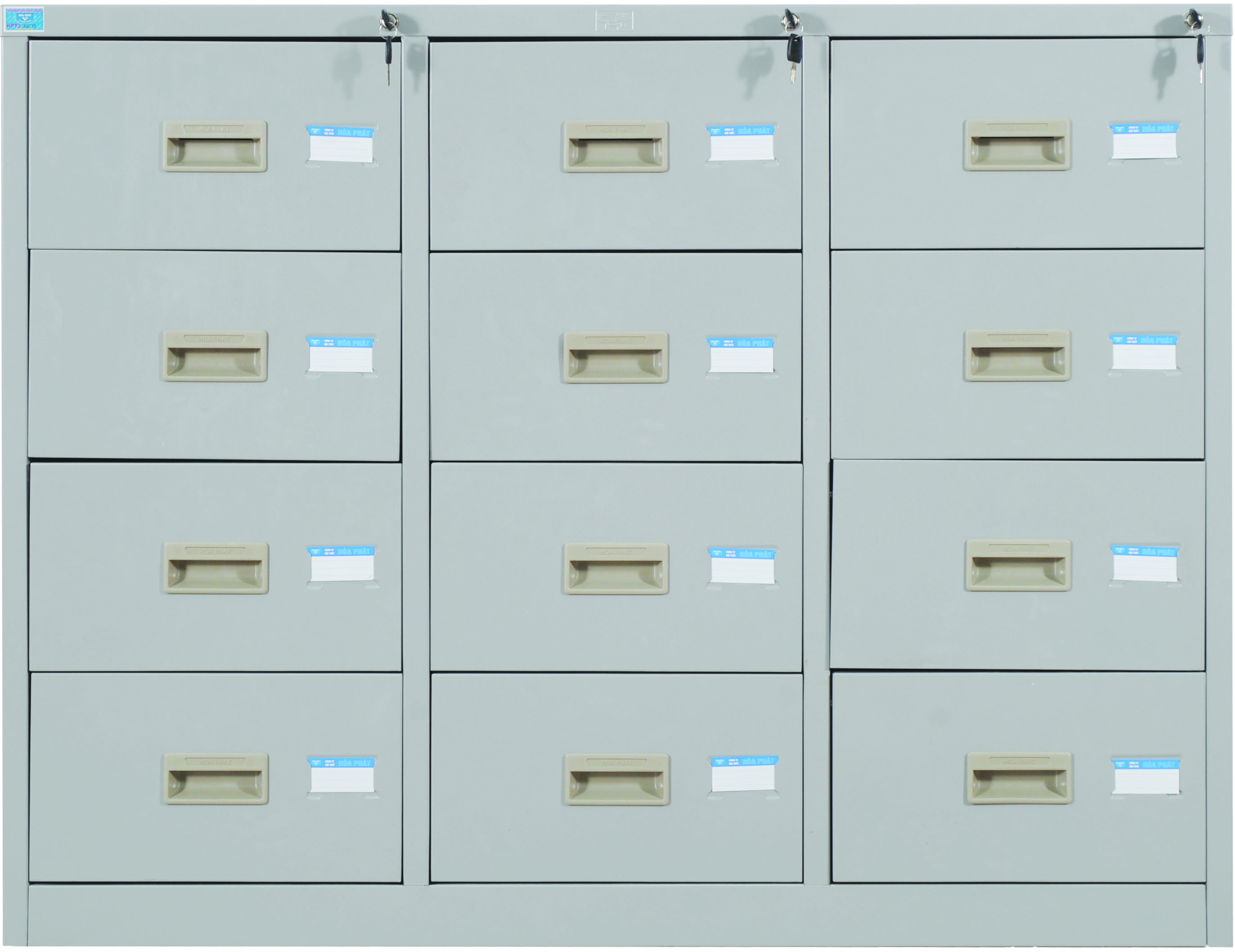 Tủ sắt Hòa Phát sơn tĩnh điện màu ghi, có 1 khối gồm 12 ngăn kéo được chia làm 3 khoang mỗi khoang 4 ngăn kéo, có khóa dàn ở mỗi khoang.